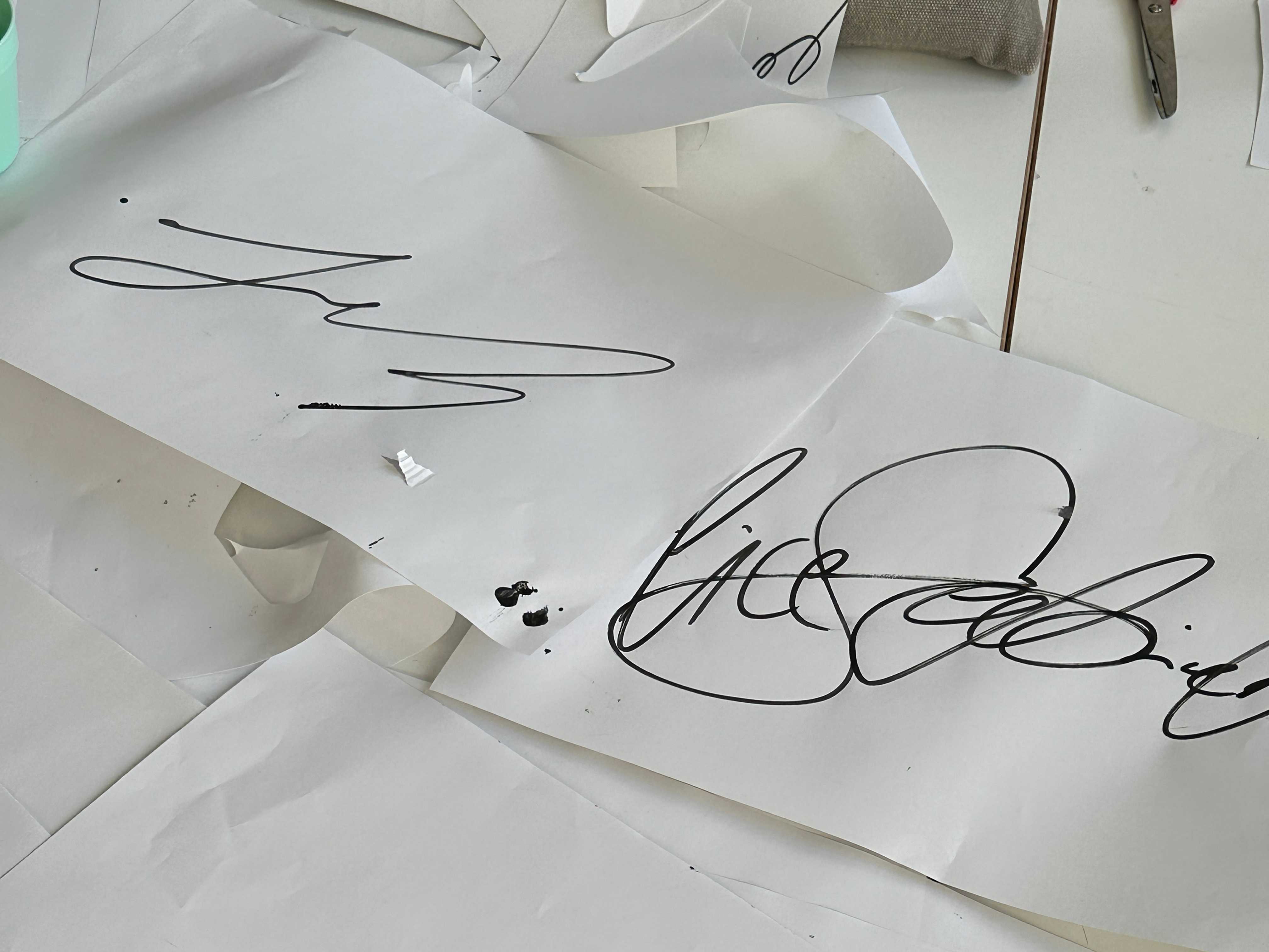 The letters led me to thinking about handwriting, especially the signature as a highly individualized token, where not only is a drawing performed using the hand and wrist that leads to more or less illegible flowing curves and angles — defined by fast motion and pressure to get things done — but also by family history, repetition, and the social construct to trust this drawing.