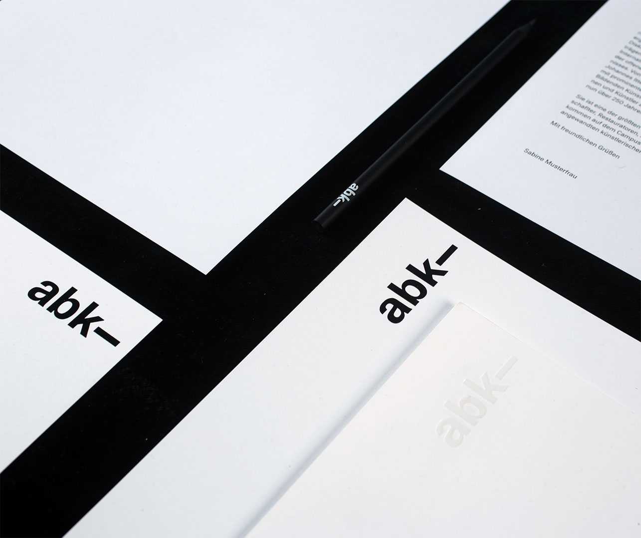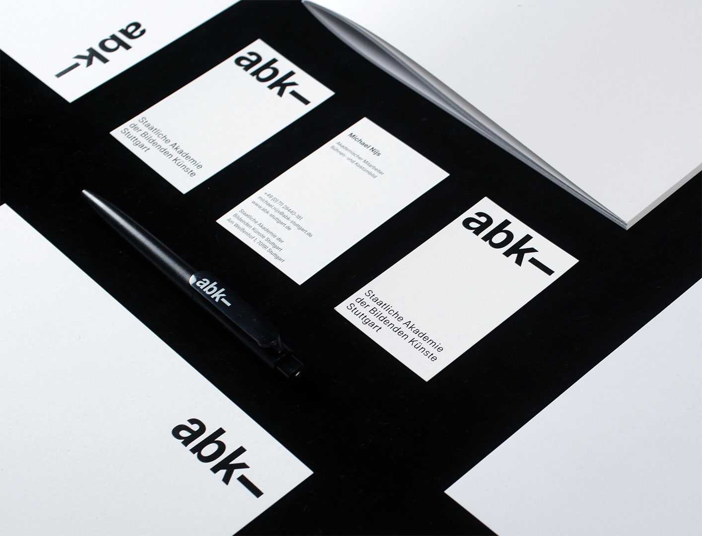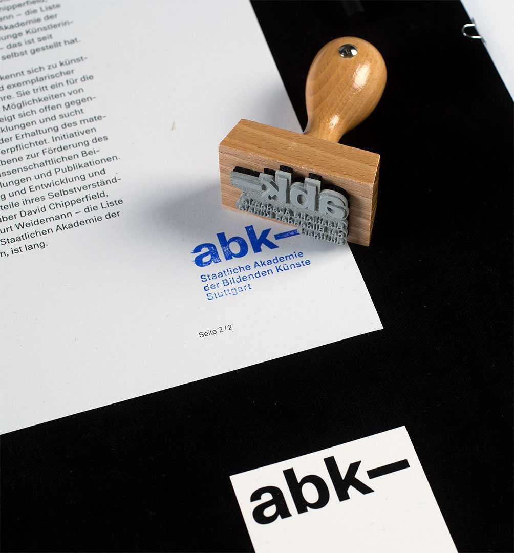 In 2019, the current corporate design of ABK Stuttgart was introduced. The extensive design and implementation of the corporate identity was undertaken by Raphael Berg, Jasmina Begović and Abdelhamid Ameur, supervised by Prof. Uli Cluss, AM Stefanie Schwarz and the professors of the Communication Design program. The custom typeface ABK Stuttgart designed by Stefanie Schwarz and Dirk Wachowiak reflects upon more than 100 years of typographic tradition of the academy by taking up features and details of historical typefaces and reinterpreting them.