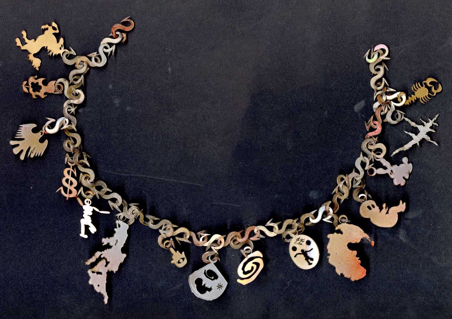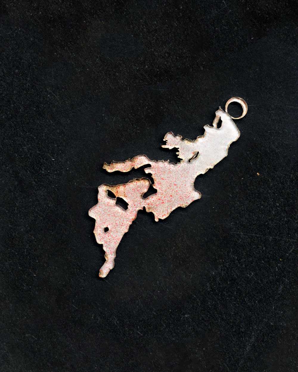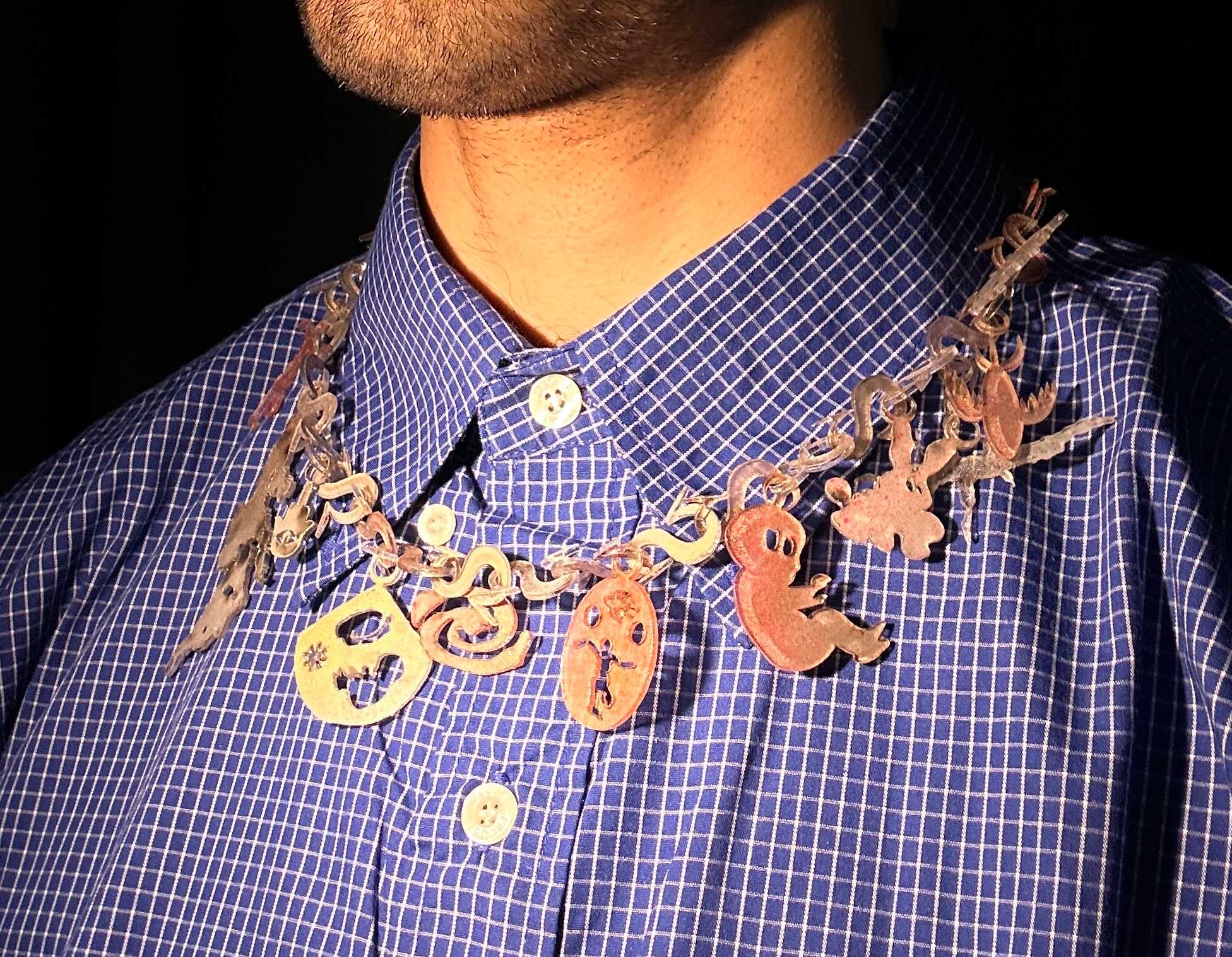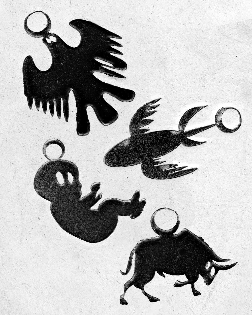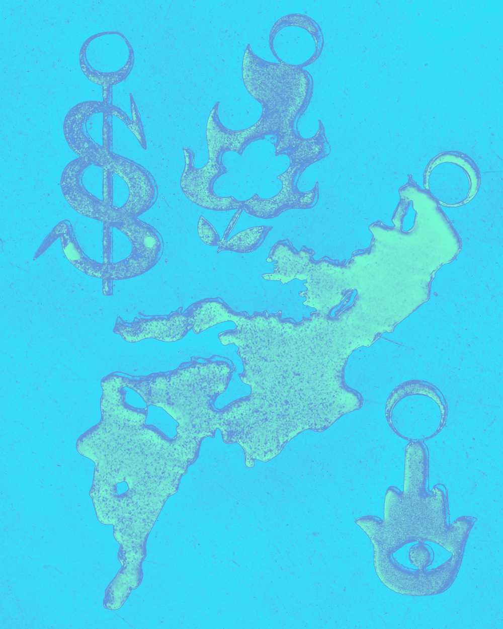 Reading through the articles in this current issue of Umbau, I felt not only a continuous anxiety when dealing with the conflicts and challenges of our times, but also a protective and hopeful tone in the texts, condensed in the titles. Inspired by this, I made a necklace with amulets (providing protection from danger) and talismans (attracting good luck) as a way to cope with my own fears and those of my generation. A middle-finger Khamsa for all the EUâs right-wing xenophobia, an upside-down Africa to challenge the idea of it being cartographed as the Global South, the shape of the Mediterranean Sea and Pangea for places of transition and belonging, the ghost of the German eagle, the Stuttgart horse, a raging bullâall derived from the stamp-clustered invalid visas on my old Algerian passport.