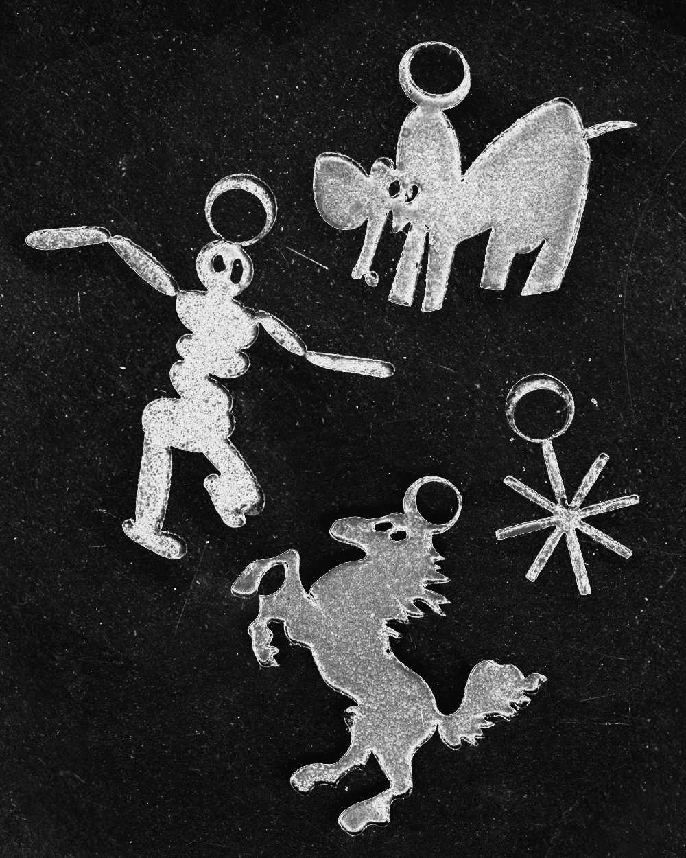 Other charms include an AI-trained human 3D model, a creepy baby, a derpy elephant, a burning flower, a branch or a scar, a scorpion, a spiral galaxy, a bird or a missile, a symbol for tax money, and a cute bunny. These motifs reference other articles in this issue, reflect on my own national identity, draw inspiration from my sisterâs and motherâs pendants, and include designs from my sketchbook that bring me joy. Some are charged with deep meaning, while others are not.