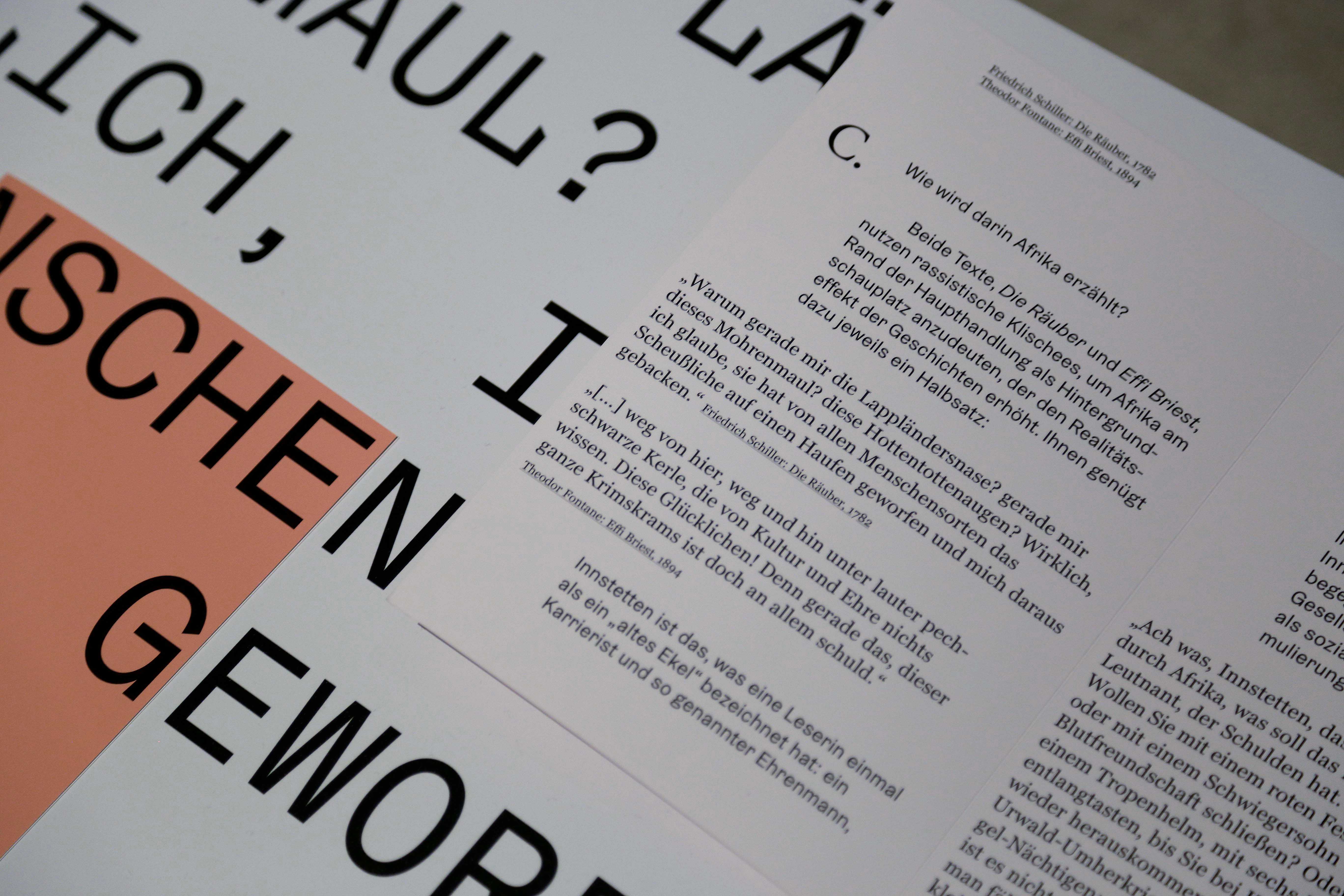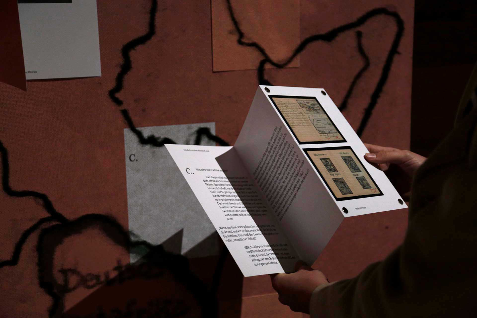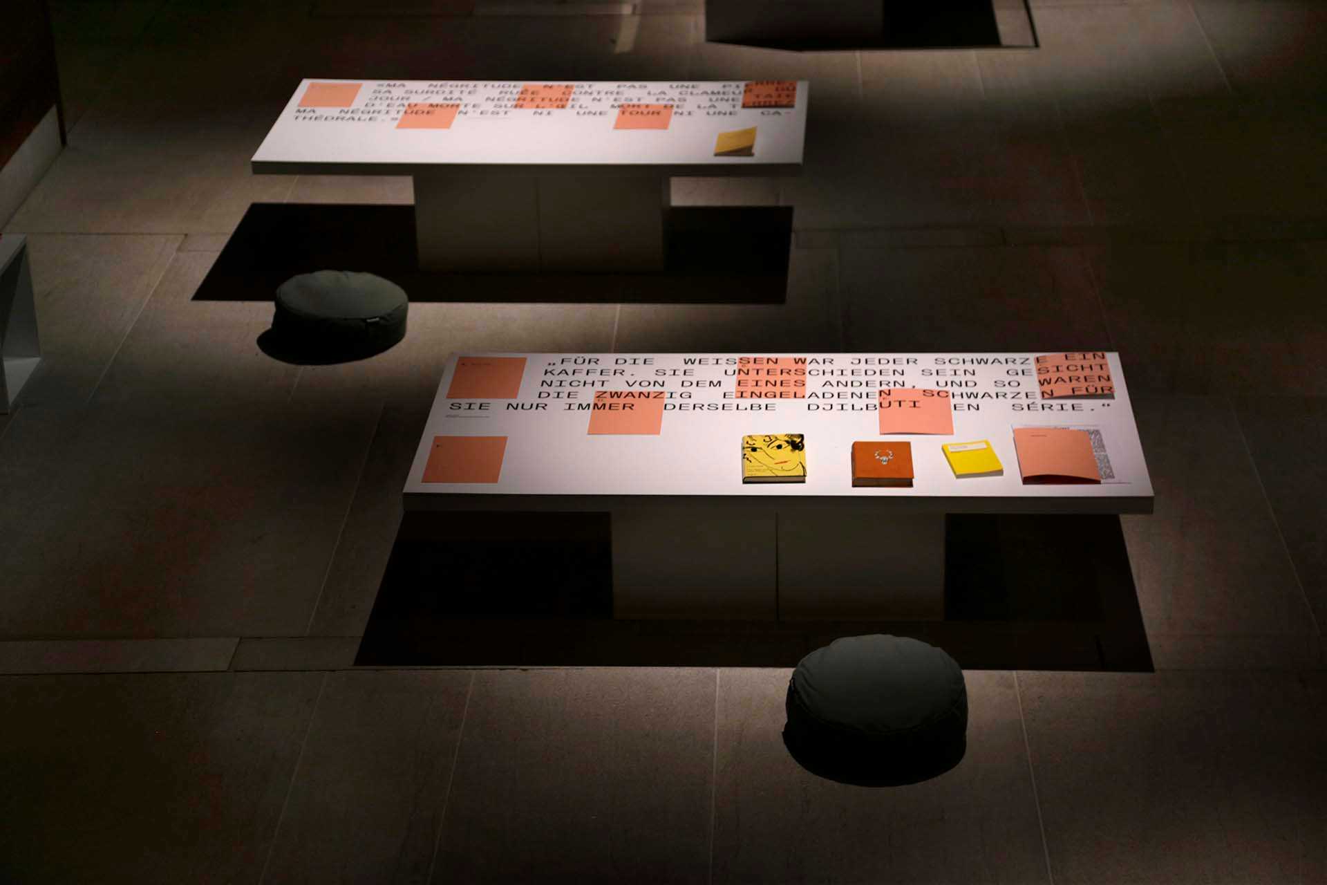 in collaboration with the Literaturmuseum der Moderne Marbach we designed the exhibition "Narrating Africa", for which we developed a system to transfer content from different curators into one exhibition space. The design concept offers the possibility to add content to the exhibition step by step over a longer period of time and to link it with each other by commenting on it. The table tops are covered with magnetic ferrofoil printed image motifs and quotations and are supplemented by expandable cards and leporellos, which, equipped with magnets, adhere to the table but can also be held in the hands. The visitor is invited to settle down on seat cushions, to open and discover the various contents and to surrender to an unusual sense of space. The visual language can be found on accompanying media such as posters, postcards, the program or the website.