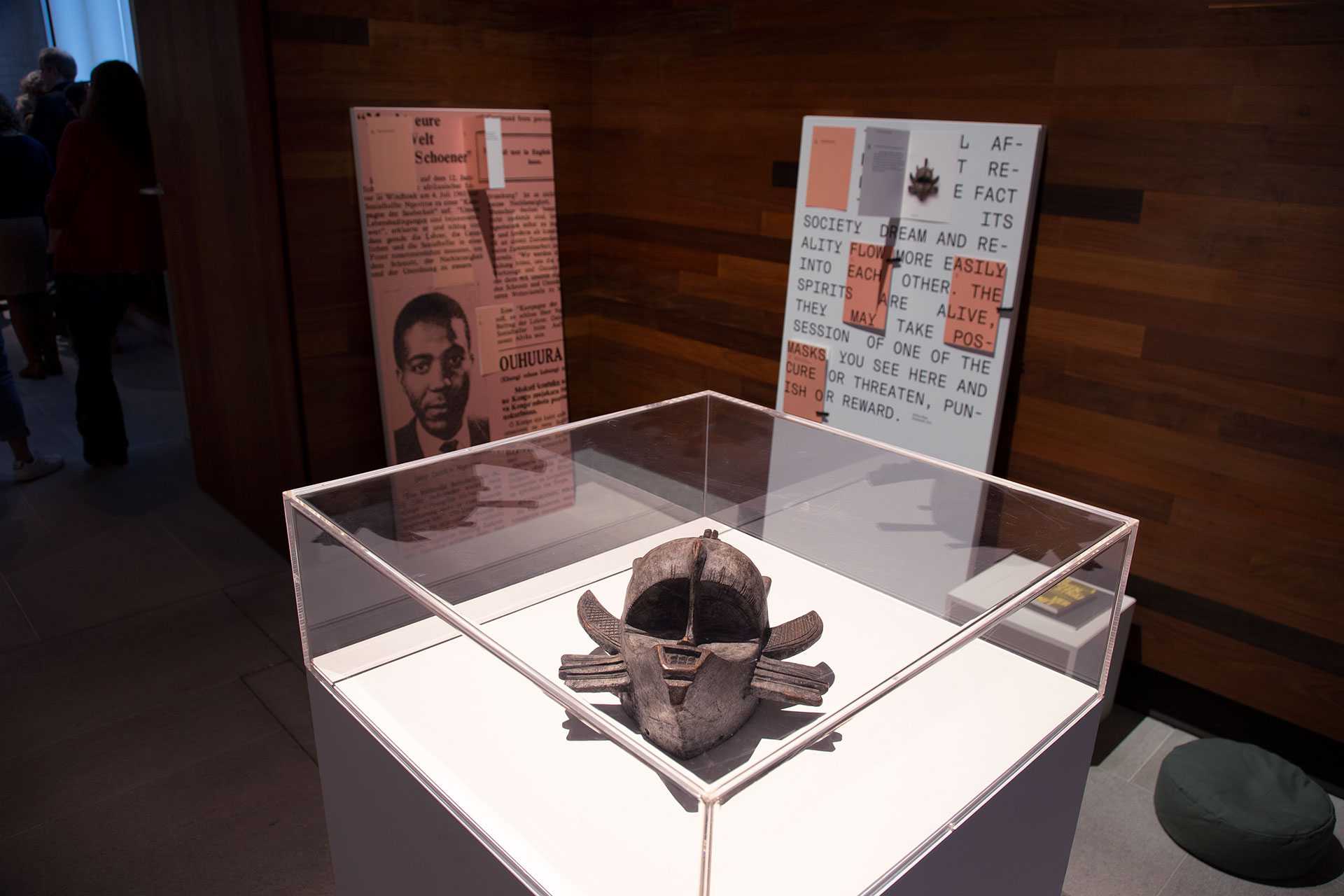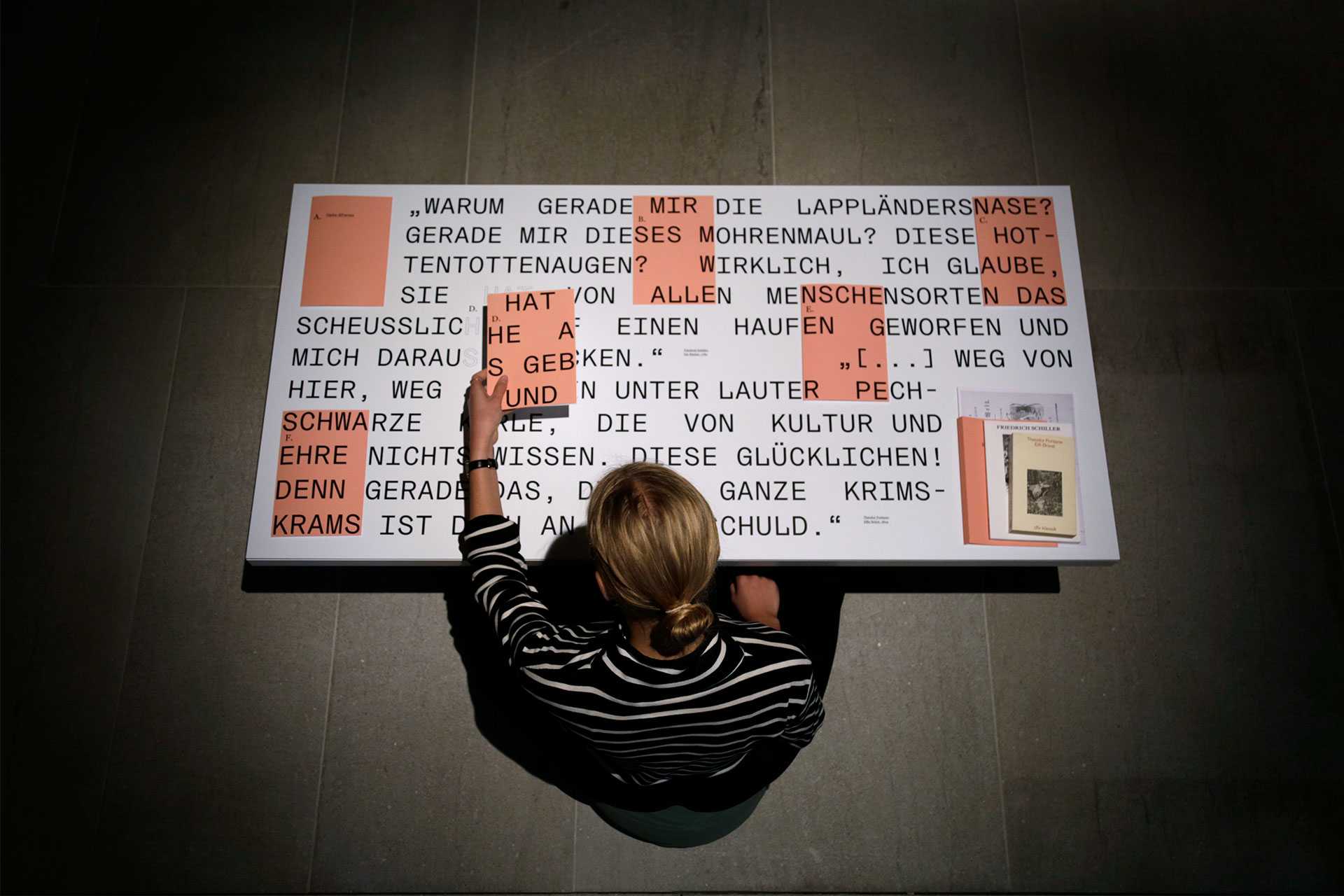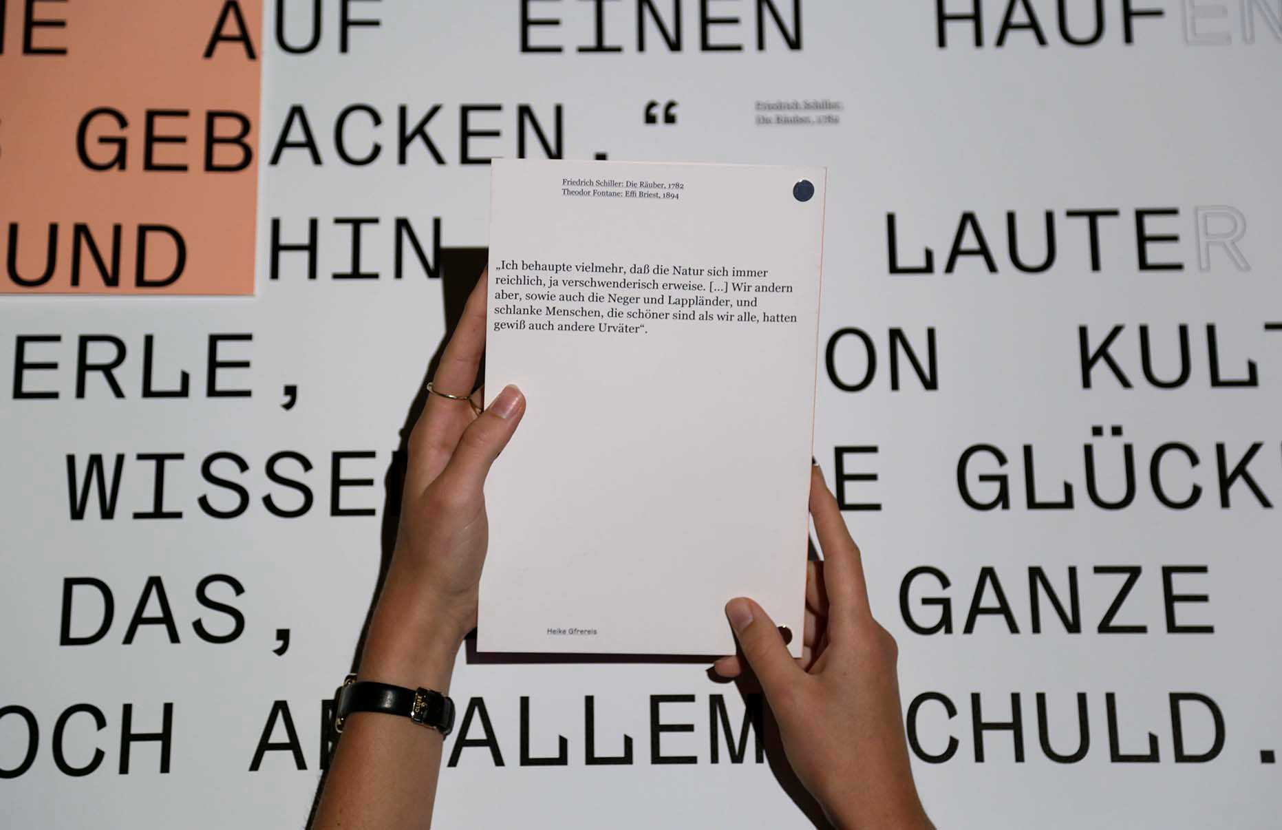 in collaboration with the Literaturmuseum der Moderne Marbach we designed the exhibition "Narrating Africa", for which we developed a system to transfer content from different curators into one exhibition space. The design concept offers the possibility to add content to the exhibition step by step over a longer period of time and to link it with each other by commenting on it. The table tops are covered with magnetic ferrofoil printed image motifs and quotations and are supplemented by expandable cards and leporellos, which, equipped with magnets, adhere to the table but can also be held in the hands. The visitor is invited to settle down on seat cushions, to open and discover the various contents and to surrender to an unusual sense of space. The visual language can be found on accompanying media such as posters, postcards, the program or the website.